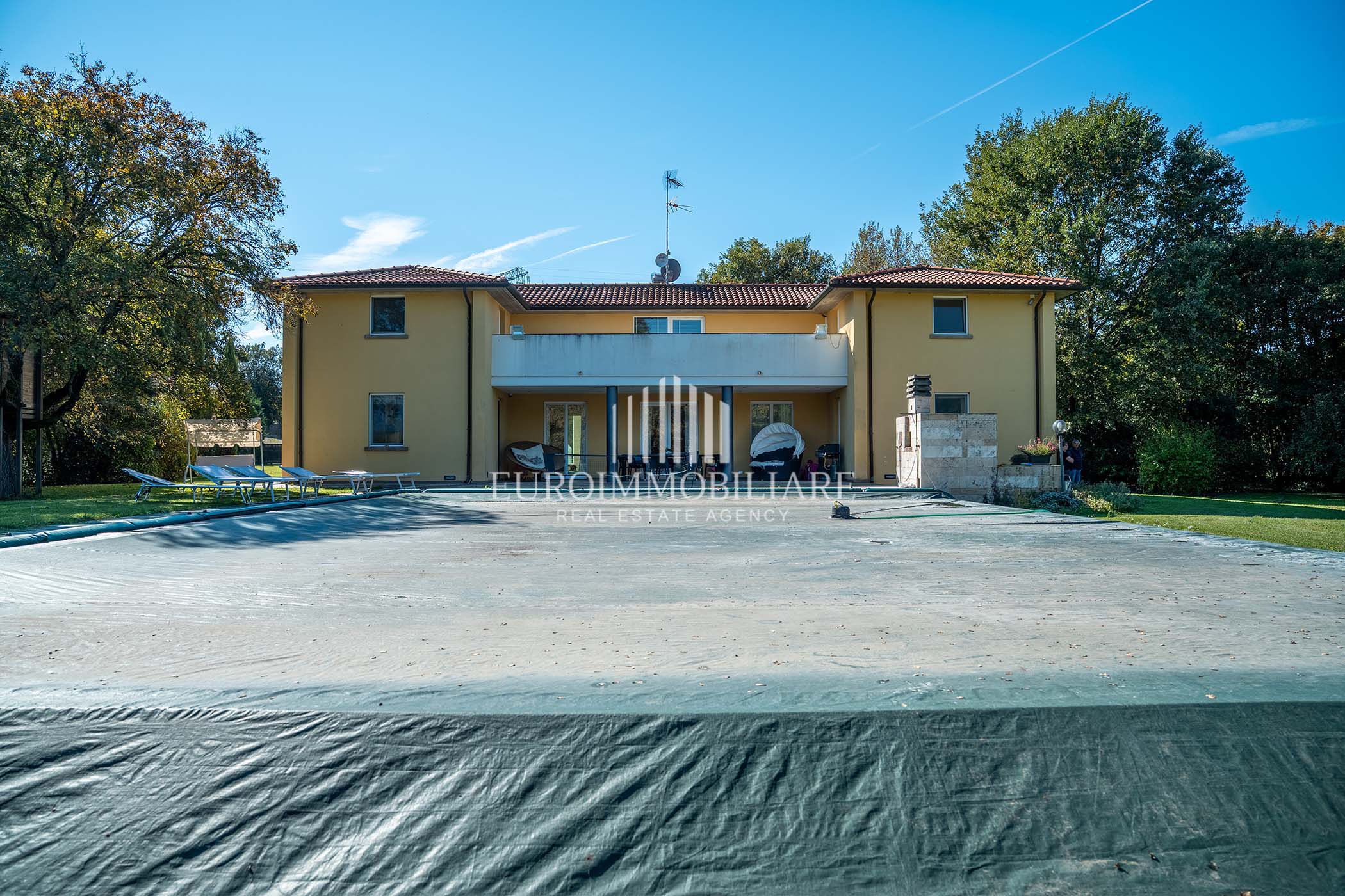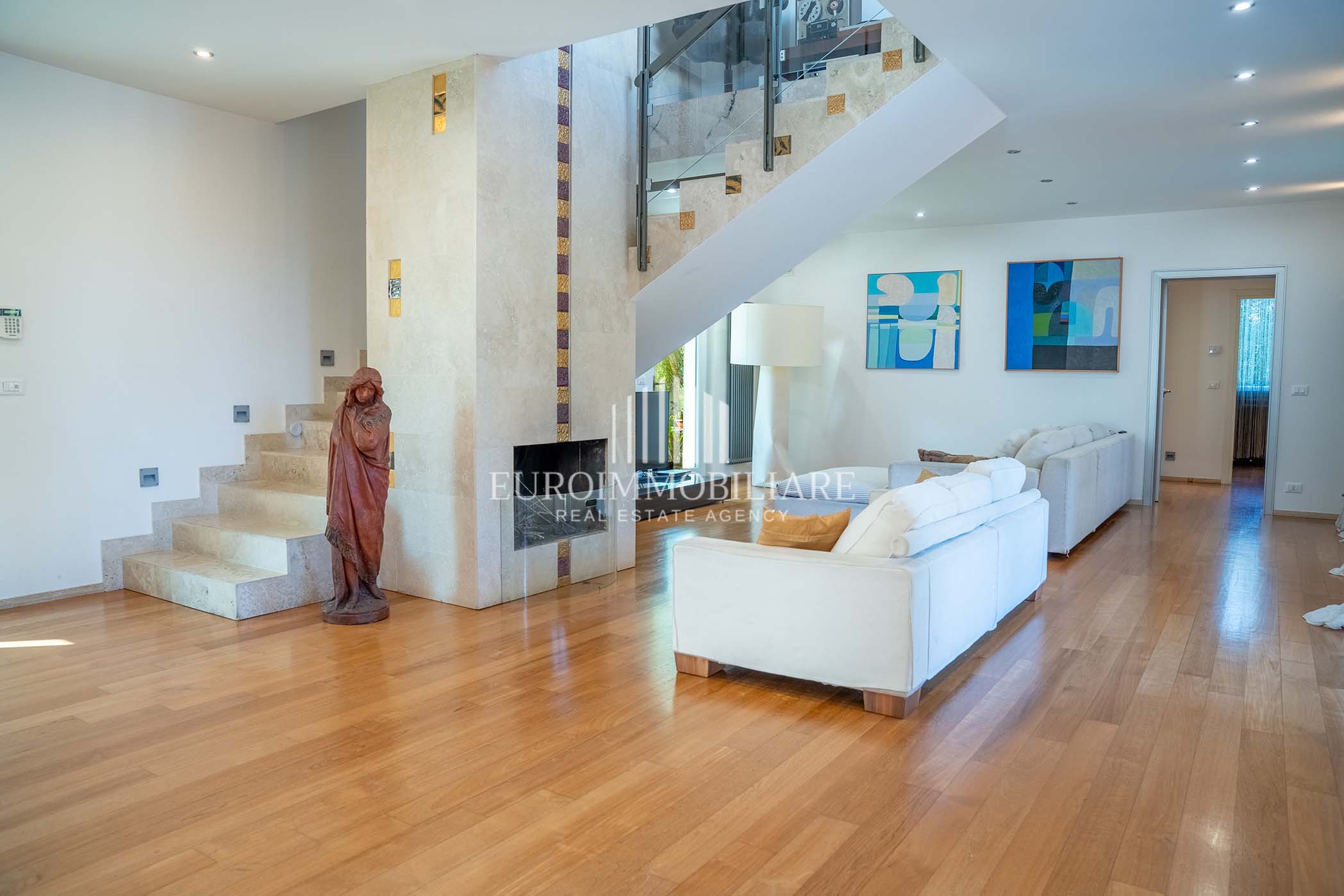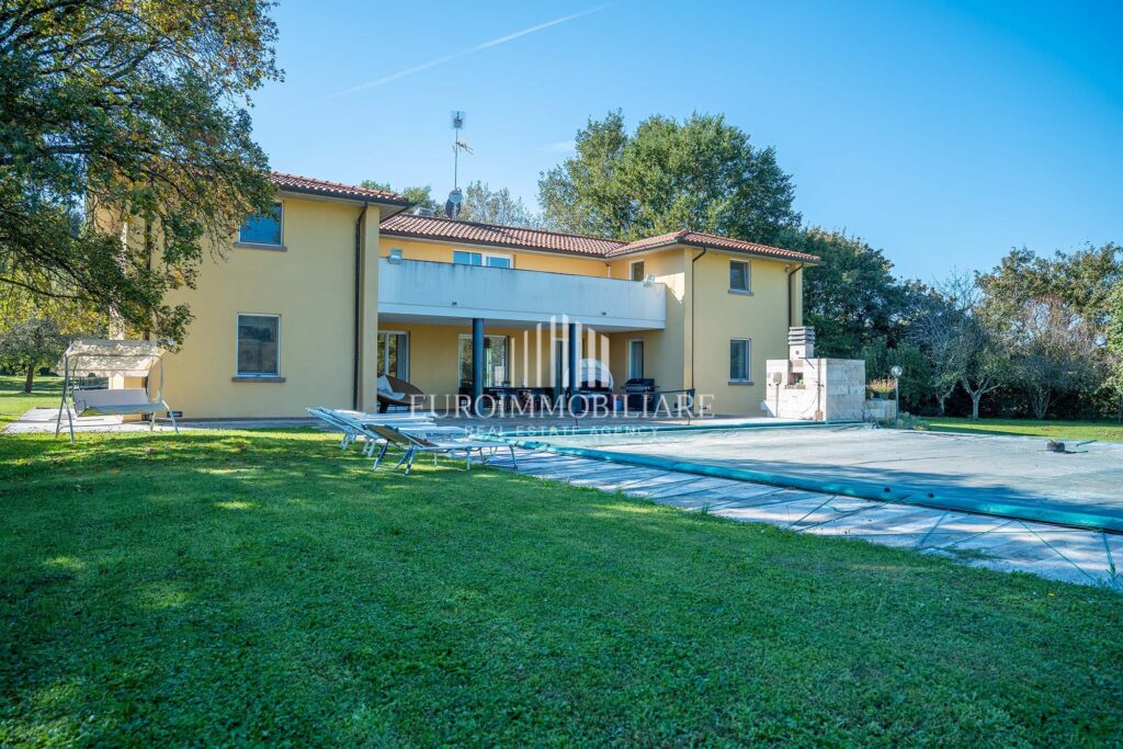 All’esterno sono presenti due ampi garage, un piano interrato adibito a cantina e locale impianti piscina, pozzo privato, illuminazione esterna per tutto il parco, area completamente recintata con due accessi carrabili.