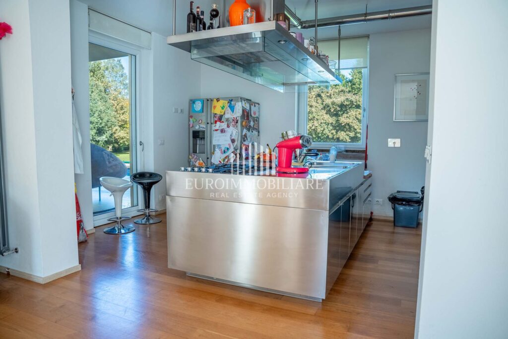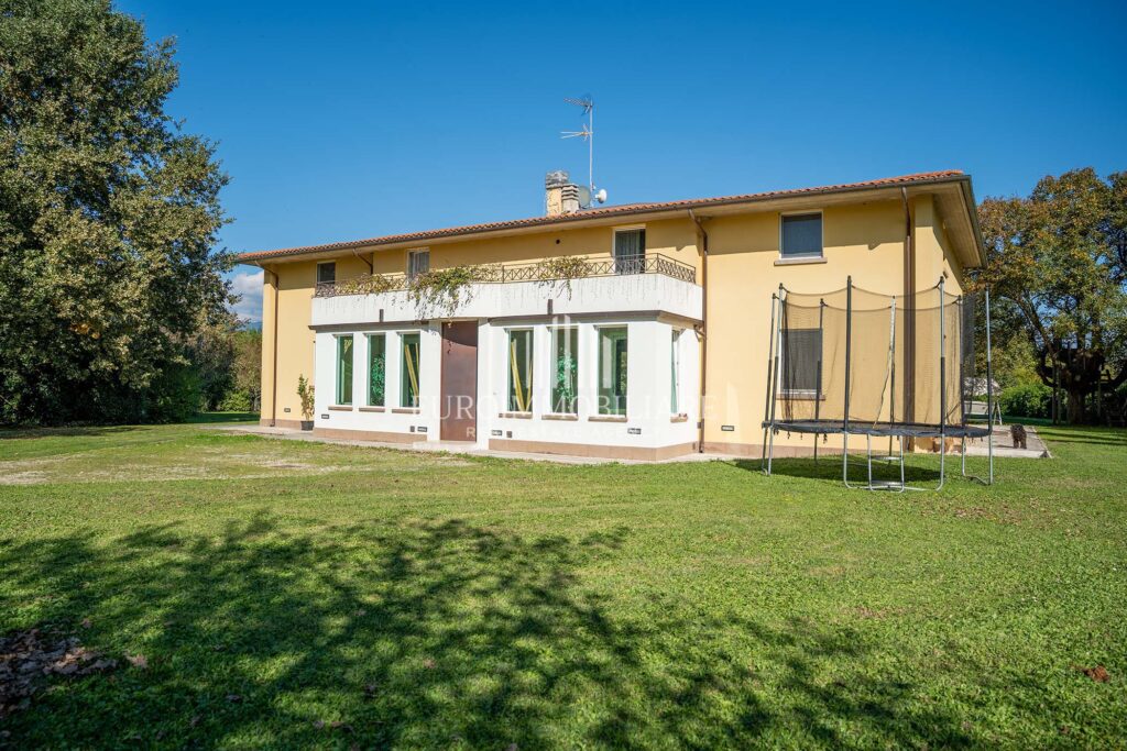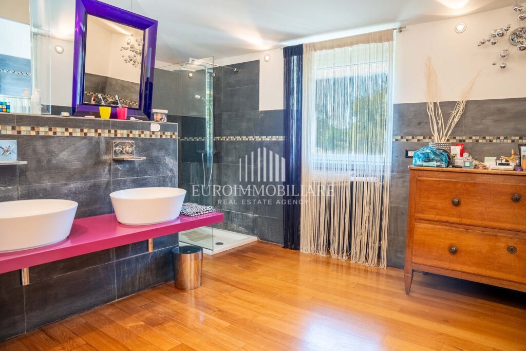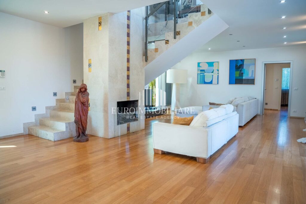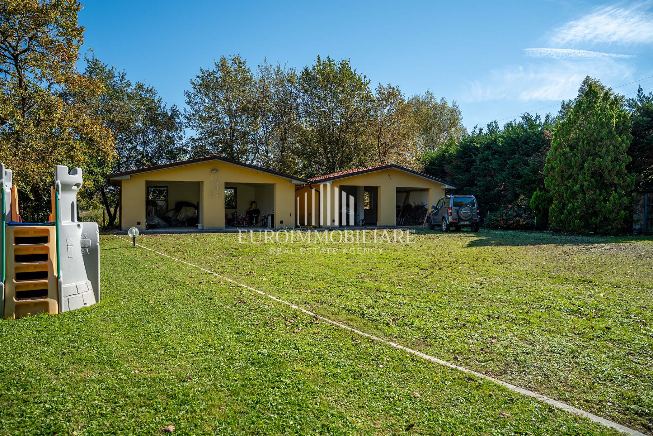 All’esterno sono presenti due ampi garage, un piano interrato adibito a cantina e locale impianti piscina, pozzo privato, illuminazione esterna per tutto il parco, area completamente recintata con due accessi carrabili.